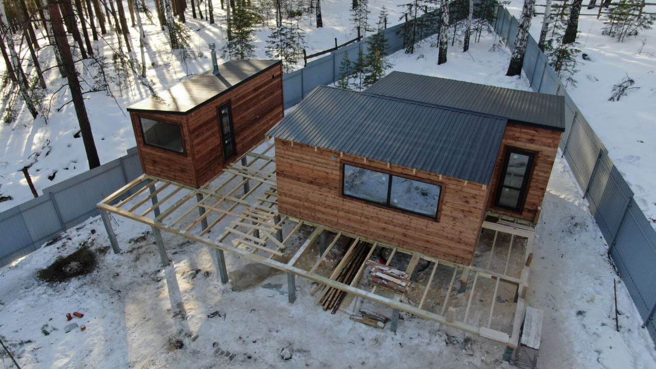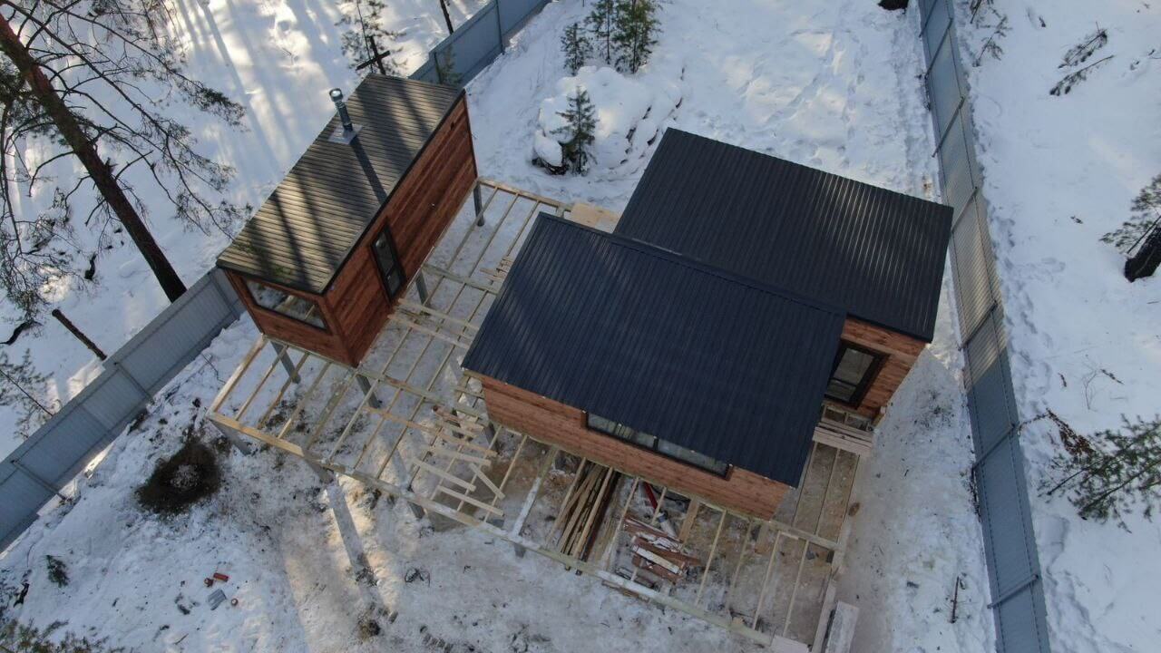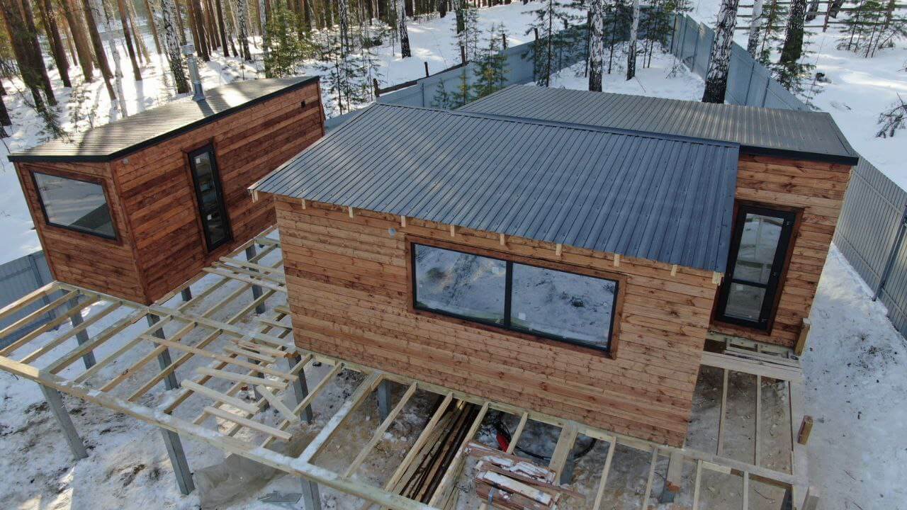 Профнастил в оттенке "Серый Графит" прекрасно сочетается с деревянными строениями.